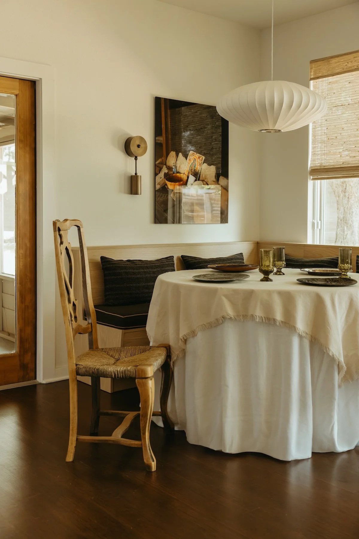Dining room with round table covered in white tablecloth, set with plates and glasses, surrounded by an antique wooden chair and built-in bench with pillows, and decorated with wall art, light fixture, and natural light from window.