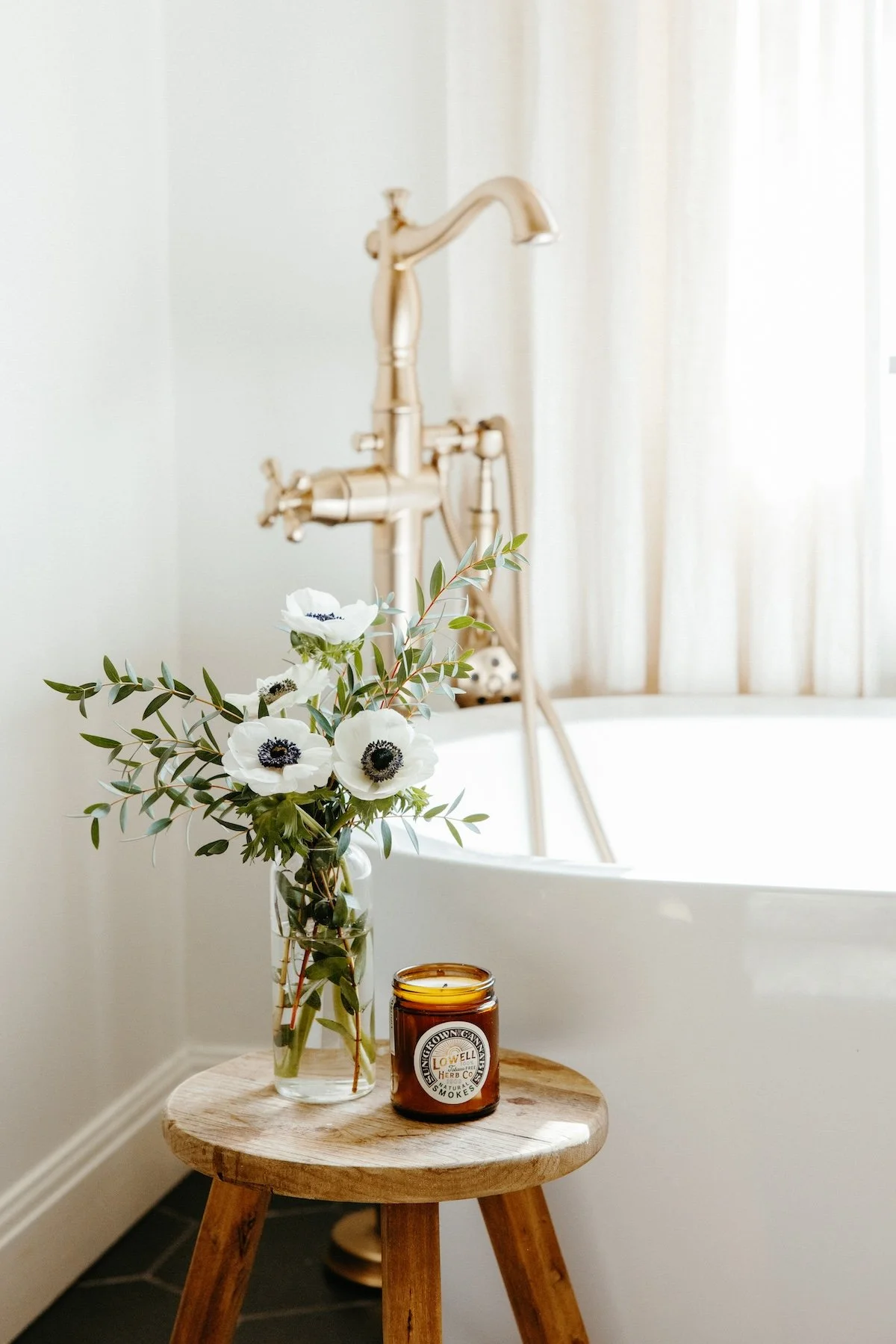 A cozy bathroom corner with a wooden stool holding a vase of white anemone flowers and a brown candle jar, with a vintage bathtub and a gold faucet in the background, illuminated by soft natural light. View fullsize