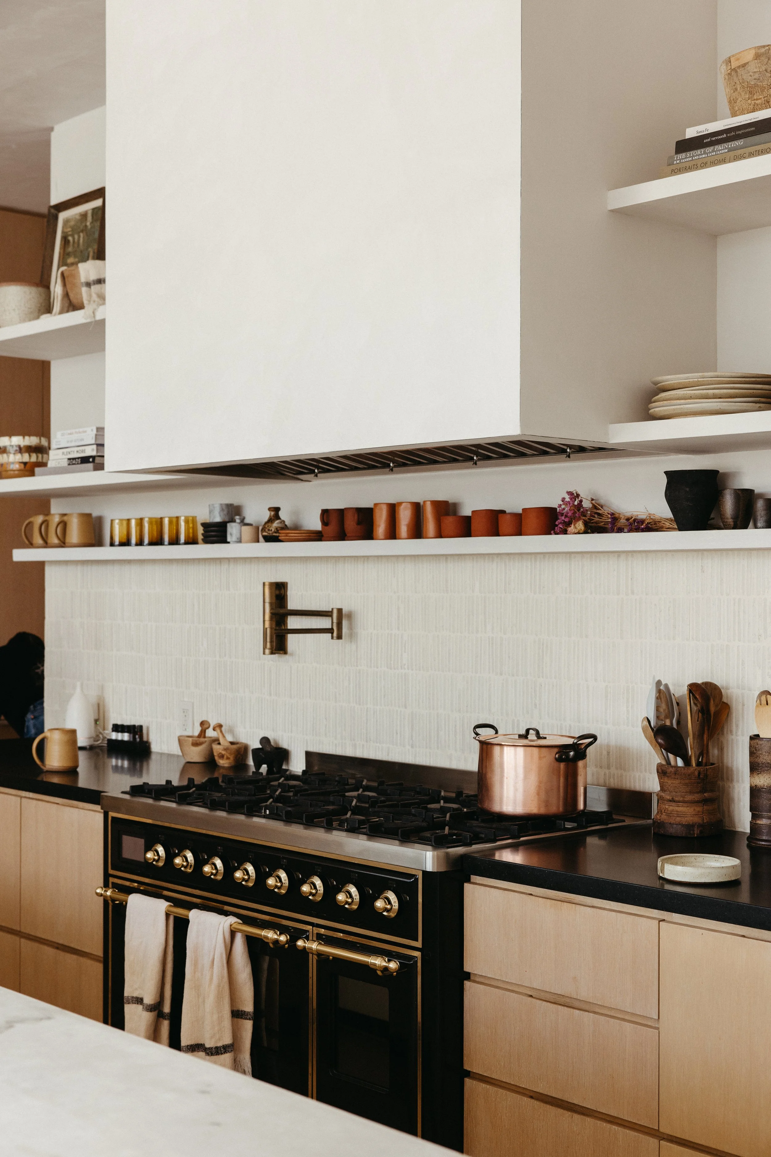 Modern kitchen with beige cabinets, black countertop, and open shelves displaying dishes, cups, and decorative items. Gas stove with copper pot, white textured backsplash, and minimal decor.