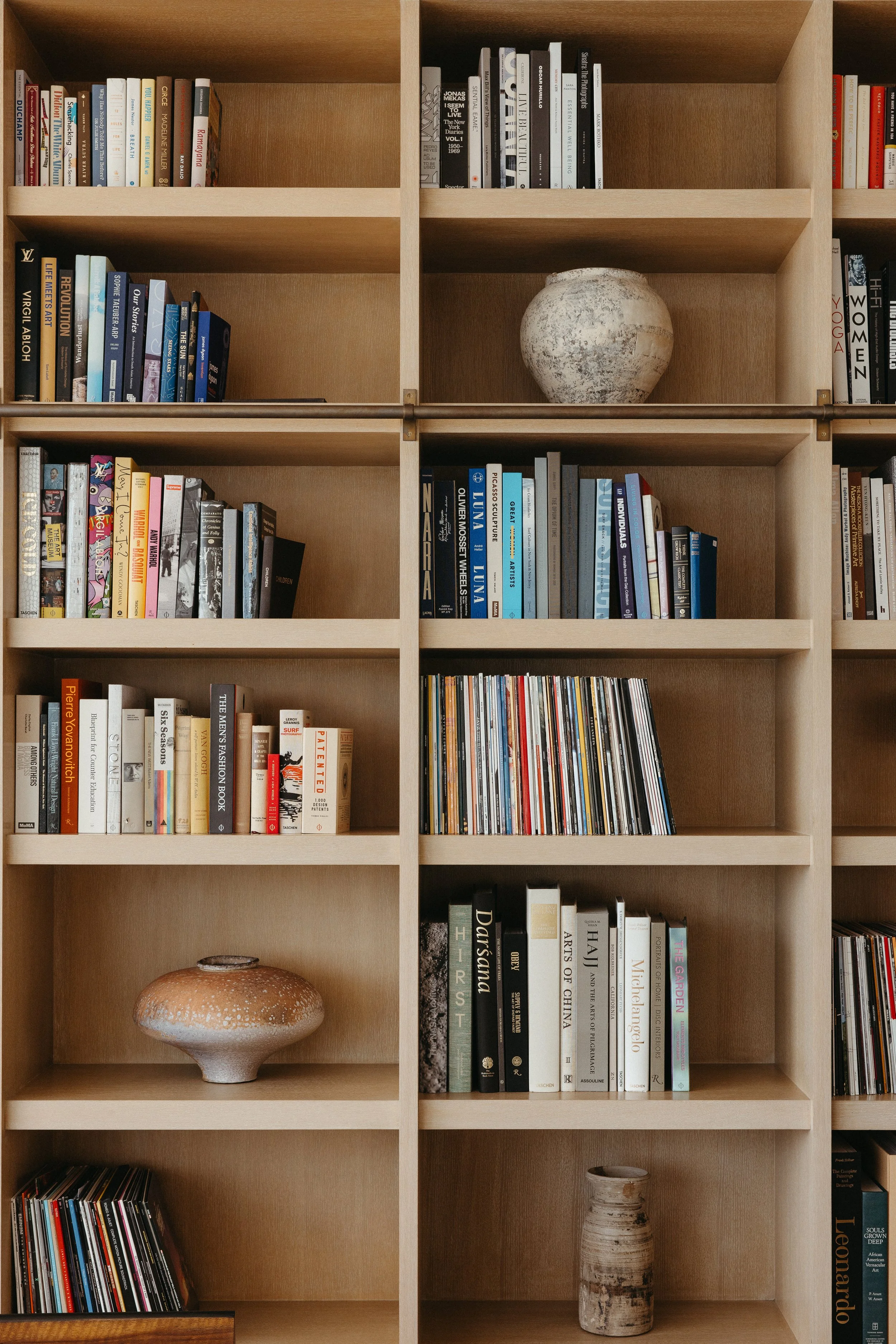 Wooden bookshelf with multiple shelves, containing books, vinyl records, and decorative vases. View fullsize