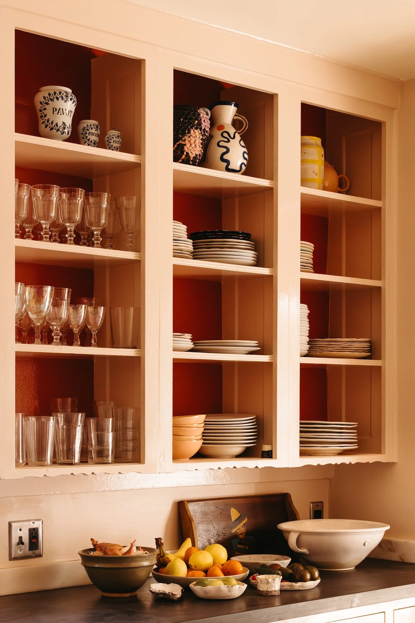 Open kitchen cabinet with dishes and decorative pottery, with a countertop below holding bowls of fruit and decorative items.