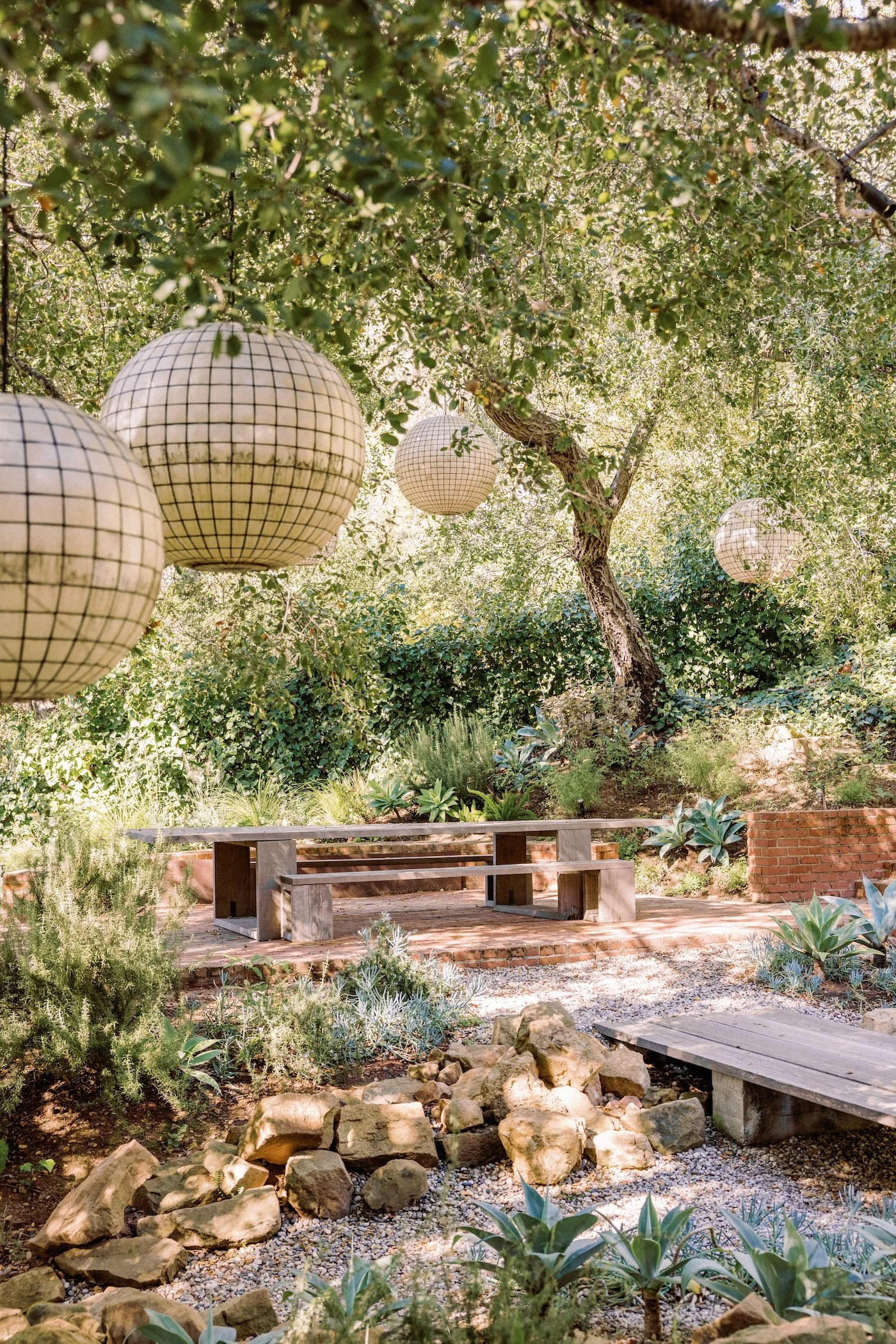 Outdoor garden with hanging paper lanterns, a concrete picnic table with benches, rocks, and various plants including agave and shrubs.