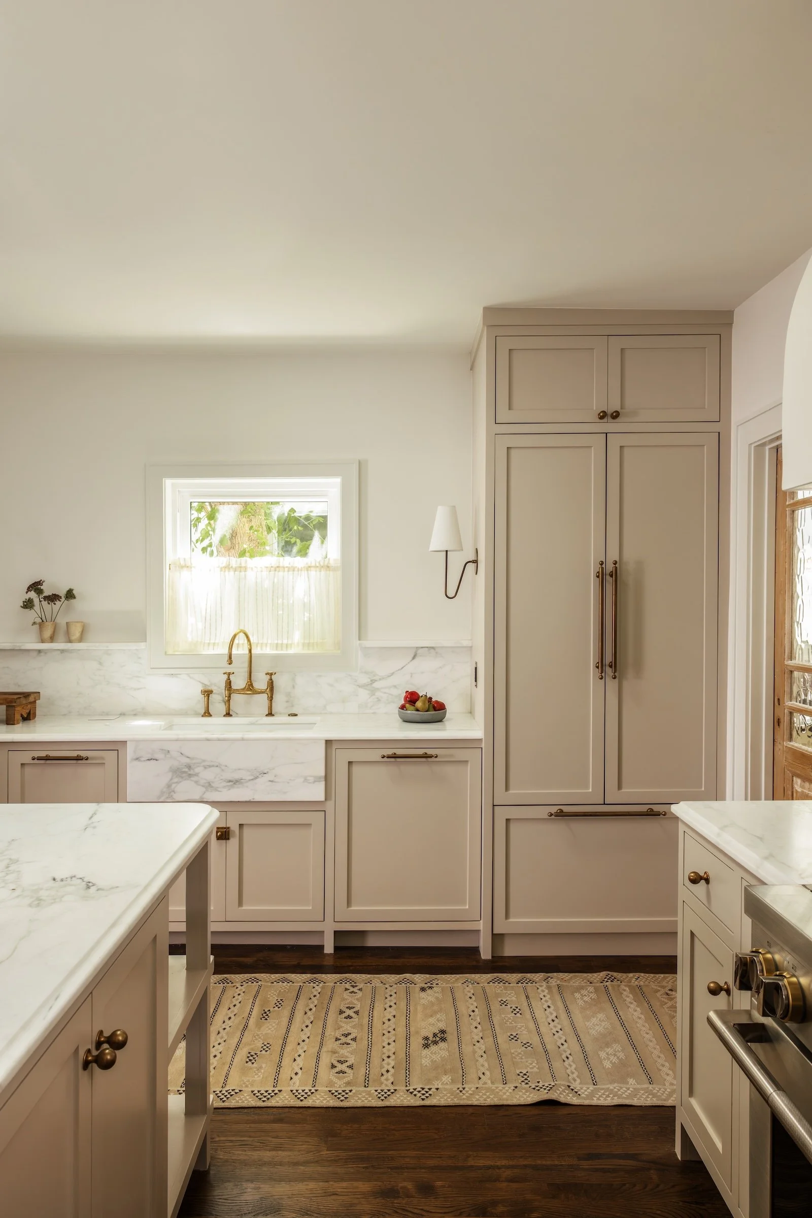 A modern kitchen featuring white cabinets, marble countertops, a small window above the sink, and a patterned rug on dark wooden floors.