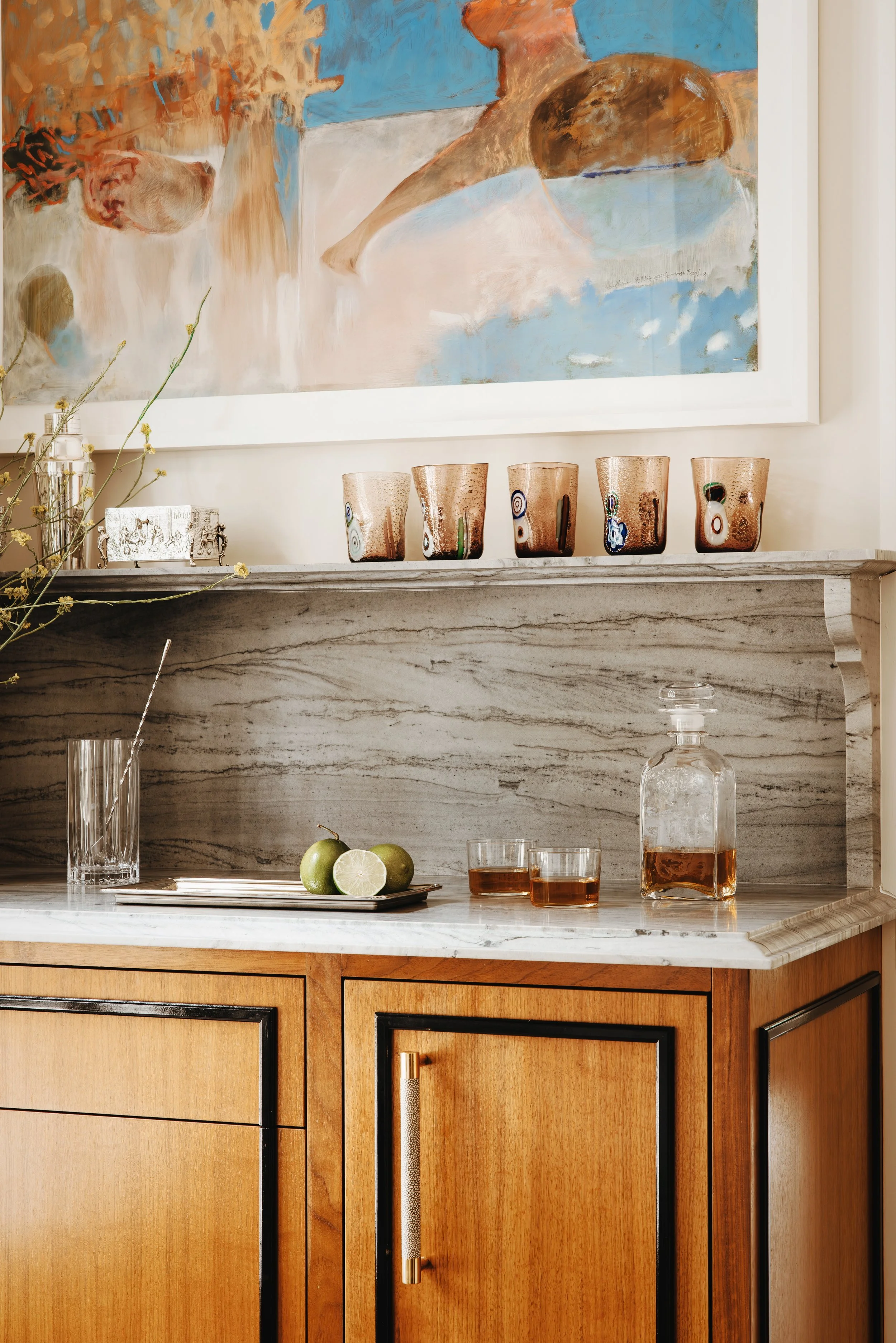 A kitchen countertop with a marble surface, containing a tray with green limes, a glass pitcher with brown liquid, two glasses filled with the same liquid, a tall empty glass with a straw, and a small silver tray with decorative green, blue, and blac View fullsize
