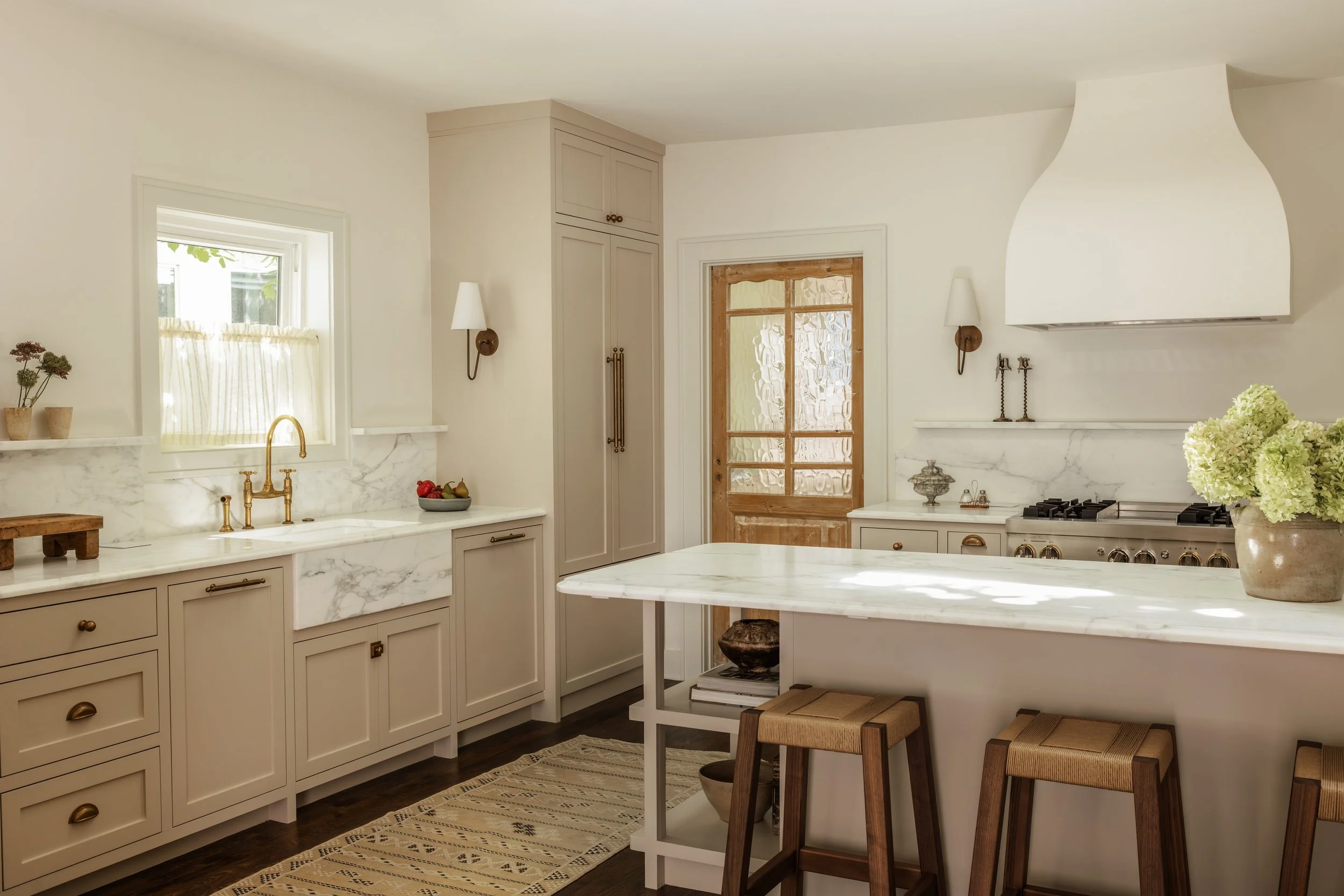 Bright kitchen with white cabinetry, marble countertops, a window over the sink, a kitchen island with bar stools, and a glass-paneled door.